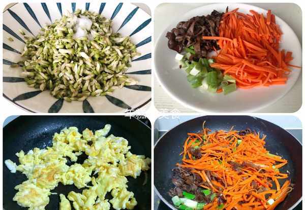 3、然後把半根胡蘿卜切成細絲,泡好的木耳去掉根部,清洗一下也切成絲,小蔥切蔥花備用