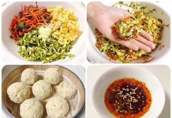 12、菜團子蒸好瞭,關火取出來裝盤,中間放上萬能料汁,搭配起來更美味