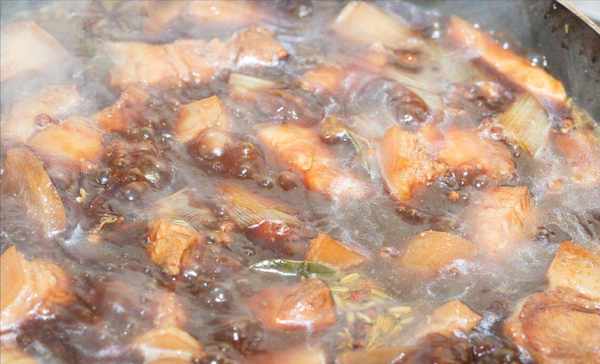 6、大火把水煮沸後,再用小火繼續燉,燉上40分鐘以上,燉到湯汁濃鬱,燉到肉質軟爛以後,我們再用鹽、雞精來調味,攪拌均勻以後,再把湯汁收一下,就可以盛出鍋啦,拌米飯真的巨香!