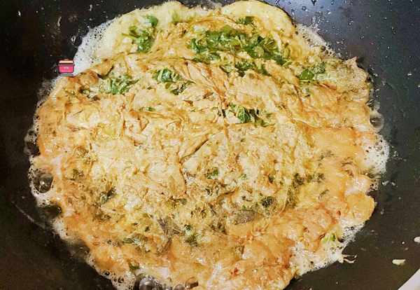 4、 鍋中燒熱油,將混合好香椿芽的蛋液倒入鍋中,不要著急攪動,開小火把蛋液烘至凝固定型,在烘蛋餅的過程中輕輕晃動鍋柄,幫助蛋餅均勻受熱。