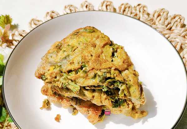 5、 待蛋餅基本熟透的時候,可以翻個面,使蛋餅的兩面都呈現出金黃的色澤,這樣不僅看起來更有食欲,而且口感也更好。關火後,用鍋鏟把蛋餅分成大塊,整齊的疊成一摞,裝盤即可。