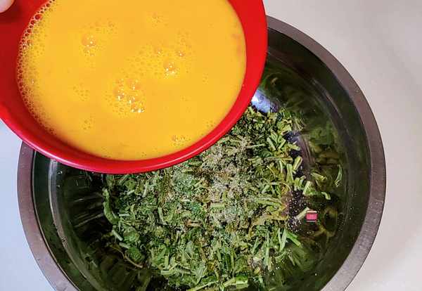 3、 雞蛋攪打成蛋液,加入少許鹽和白胡椒粉去腥,把打好的蛋液倒入香椿碎中,再加入少許花椒粉,混合均勻。