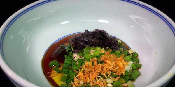 2.調料碗:大蒜切成蒜末、小蔥切蔥花,全部切好後裝入碗中,再加入一勺生抽、半勺香醋、少許食鹽、一小勺雞精、一點老抽、一勺蠔油、一點胡椒粉、一勺食用油、少許香油、再加入一點紫菜、一勺蝦皮備用。