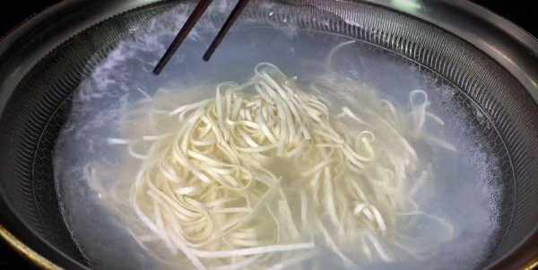 3.鍋內倒入適量的水,水開後下入面條,用筷子翻動幾下,使其受熱均勻,防止粘連在一起,鍋內煮開後,加入少許涼水,繼續大火煮開,再加入第二次涼水,鍋內再次煮開,撈出放入涼水中。