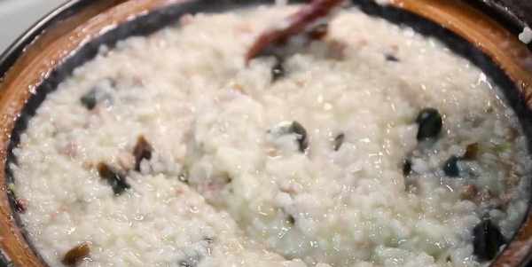 2.砂鍋內倒入適量的清水,大火燒開,再倒入凍好的大米,中小火煮開,加入少許植物油,蓋上蓋子,小火燉煮8分鐘。