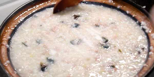 4.8分鐘後,鍋內已經變成濃稠,倒入皮蛋、瘦肉、薑末,用勺子攪拌均勻,再次開中火熬煮兩分鐘,再加入適量鹽,攪拌均勻就可以出鍋瞭。