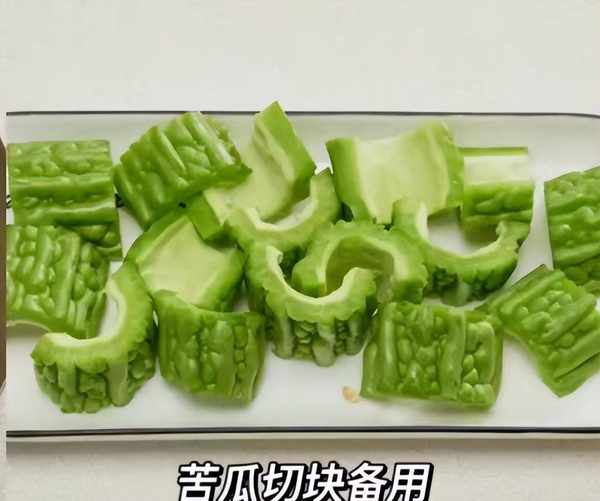 2:苦瓜切掉兩頭,從中間切開,用勺子挖掉黃色的瓜瓤,反復用清水洗幹凈,切成若幹塊狀,備用。
