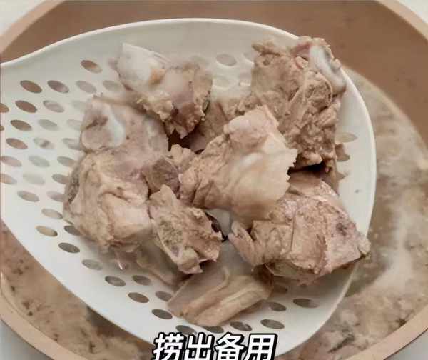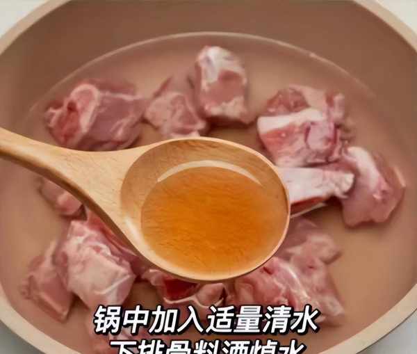 3:排骨全部剁成排骨塊,排骨塊用冷水沖洗幾遍,生薑切成若幹片狀,鍋中放入排骨,加上適量冷水沒過食材,加上適量料酒,丟入蔥薑去腥,煮3到5分鐘,舀掉一些浮沫,用溫水沖洗和浸泡。