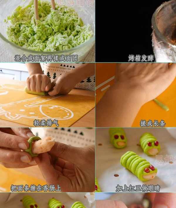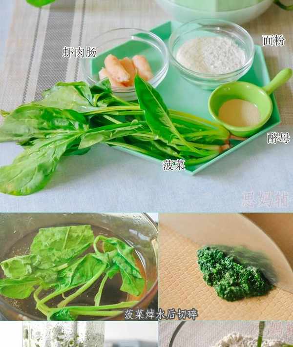 酵母0.8克、菠菜5克、面粉50克、自制蝦肉腸適量(其他適合寶寶吃的肉腸也可)