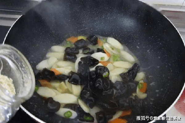 2,鍋中燒水,水開後放入山藥和黑木耳焯水撈出,另起鍋燒油,油熱放入控幹水分的山藥和黑木耳炒勻。