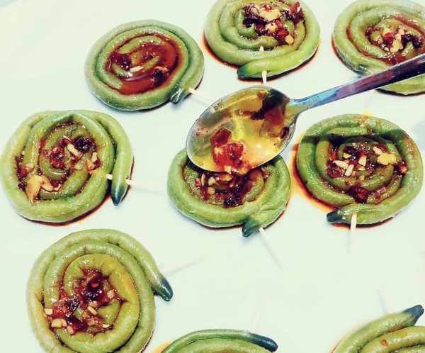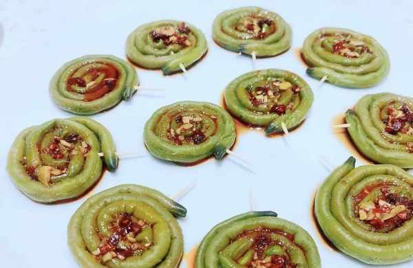 1.取一把豇豆洗凈,冷水浸沒豇豆,加入1茶匙鹽、2茶匙油用中小火將豇豆煮熟,煮熟後將豇豆撈起來,冷水沖涼豇豆。將煮熟晾涼的豇豆輕輕裹緊,再用牙簽穿起;