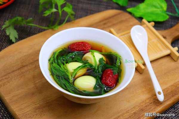 【艾葉紅棗煮安全蛋】艾葉煮紅棗,是很多女人都適合,經常喝臉色紅潤。食材:艾葉50克、紅棗6個、紅糖10克、鵪鶉蛋5個、生薑1片。1.鵪鶉蛋鍋裡,倒入冷水煮熟,放涼之後去殼。2.艾葉清洗幹凈,焯水,再用冷水清洗去苦。2.清洗幹凈的生薑,切絲,放入鍋裡,接著放紅棗、紅糖,倒入適量的水煮沸之後,放入艾葉、鵪鶉蛋。3.轉為小火,再次煮2分鐘,即可。