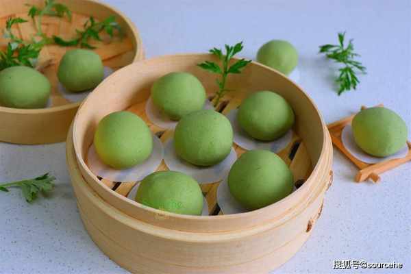 【艾葉饅頭】蓬松香軟,濃濃的艾葉清香,很好吃的饅頭。食材:面粉500克、酵母5克、艾葉漿糊260克、白砂糖80克。1.艾葉清洗幹凈,鍋裡倒入適量的水煮沸之後,放艾葉,焯水。焯水之後用冷水清洗艾葉多次。2.把艾葉放入果汁機,打成漿糊。取260克,加80克白砂糖,攪拌至白砂糖溶解。3.把面粉加入攪拌、揉搓光滑的面團,蓋上一塊濕佈,讓面團發酵至2倍大。4.取出,揉搓排氣,然後分成小團,揉搓光滑,放入蒸鍋,隔水蒸12分鐘。艾葉饅頭就做好瞭。