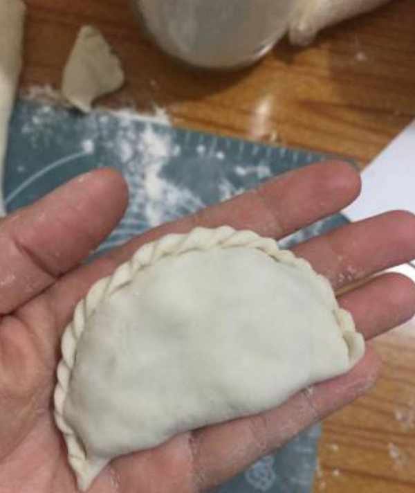 步驟6包入餡料,邊上捏緊。後來吃時覺得沒有花邊應該好吃此,因為薄;
