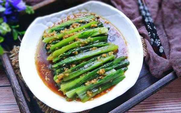 擺入蒜末,將蒜蓉油熱澆於蒜末之上,蒜蓉油麥菜便制作完成,任何人制作成功都十分簡單,食之爽口不油膩。