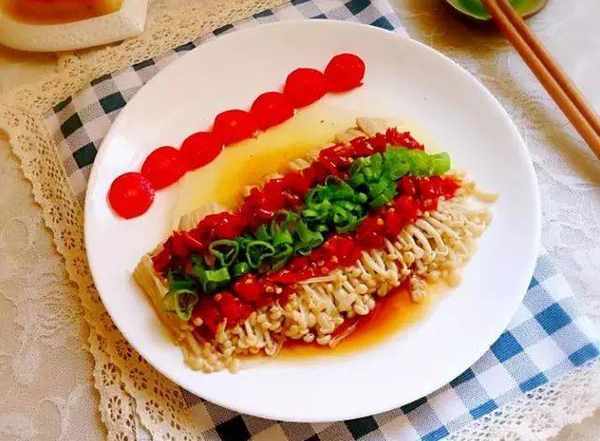 把剁椒鋪上金針菇,鋪上的樣子要漂亮些。蒸鍋裡加清水燒開,放入金針菇,蓋上鍋蓋蒸制5分鐘,容易成熟,不用蒸得太長時間。