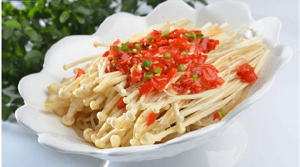 4.泡椒澆到金針菇上。撒上香蔥點綴即可