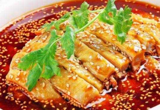 第1種呢就是口水雞,首先先把雞腿洗幹凈,之後冷水入鍋,加入薑片,料酒,大火燒開之後再轉成松小火,煮至10分鐘,然後關火燜5分鐘之後再撈出,過涼後進入提前準備好的冰水裡面,迅速激冷,然後瀝幹水分,塗一層香油,稍稍晾幹,再將醋生抽白糖和少許的鹽調成料汁,其中醋生抽白糖的比例為3:2:0.5,然後將雞腿折成,折成塊兒擺盤,撒上花生碎和白芝麻,再淋上料汁和紅油,最後再撒上蔥花就可以瞭。