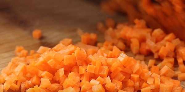 2.胡蘿卜去皮,先切片,再切成條,最後切成小碎丁。