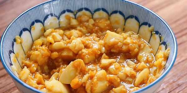 8.蒸的時候做個雞蛋蒜泥醬。一把大蒜加鹽把它搗碎,然後再加入2個雞蛋搗碎,放入碗中,調入生抽、少許香油,適量米醋,翻拌均勻就可以瞭。