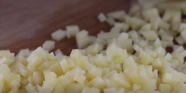 3.準備一個土豆,去掉外皮,先切成片,再切成條,最後切成丁備用。