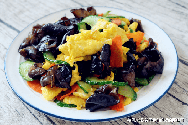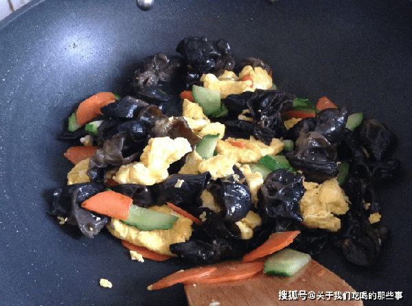 2、起鍋燒油,六成熱時倒入雞蛋液,大火煎熟後炒成大塊,盛出備用。鍋裡留底油,放入黑木耳翻炒一會兒,再倒入胡蘿卜炒一會兒,炒至斷生。倒入黃瓜片、雞蛋塊,加入適量食鹽調味,翻炒均勻後即可出鍋。