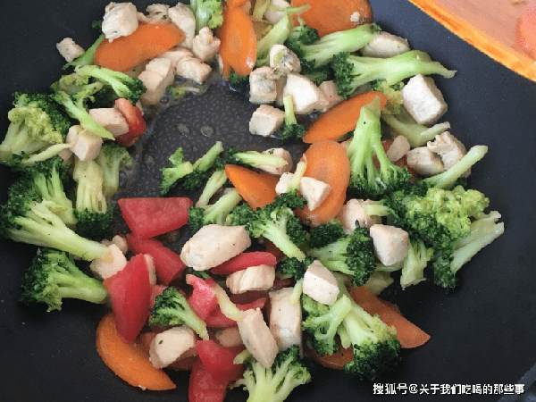 3、鍋裡留底油,放入西紅柿塊炒出紅汁,再倒入西藍花、胡蘿卜,大火翻炒2分鐘,最後放入炒好的雞胸肉,加適量食鹽、生抽、蠔油調味,翻炒均勻即可出鍋。