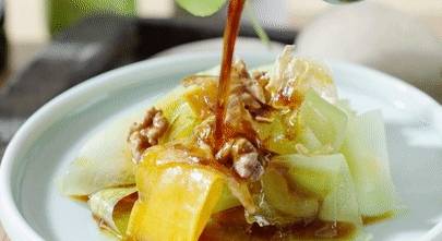 3、將蔬果薄片撈出控水後,加入核桃仁、木魚花,拌入調好的料汁後,便能獲得瞭一份完美的清爽美味——萵筍雪梨沙拉!
