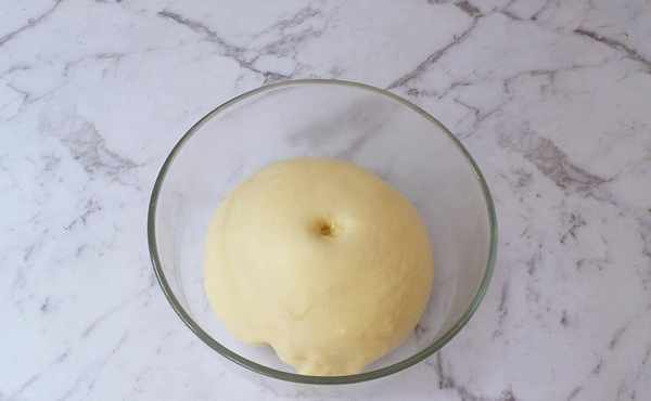 3、取出揉圓放在溫暖處發酵,等發酵至兩倍大左右,手指在面團戳一個小洞,不反彈不回縮就發酵成功瞭