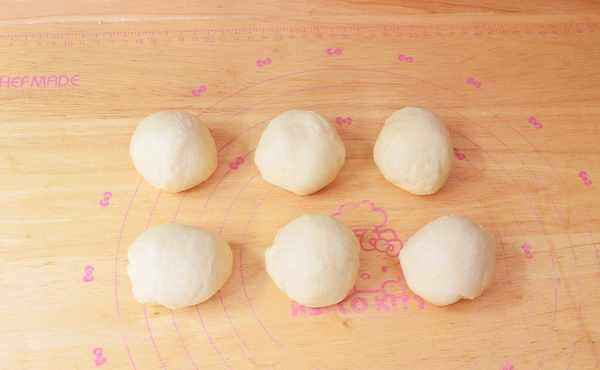 4、將面團取出排氣,分成相同大小均勻6個小劑子,蓋上保鮮膜醒發10分鐘