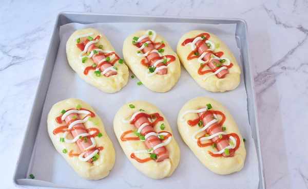 6、火腿腸去掉腸衣,對半切開,蔥切蔥花,等再次發酵至兩倍大左右,將火腿腸填入中間,表面刷上蛋液,擠上沙拉醬和番茄醬,再撒上蔥花