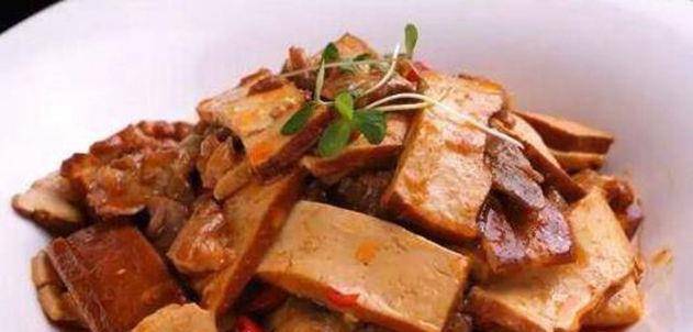4,鍋中留少許肉油,放入香幹兩面煎好,倒入炒好的瘦肉,加入少許辣椒油炒均勻,撒少許味精出鍋盛盤