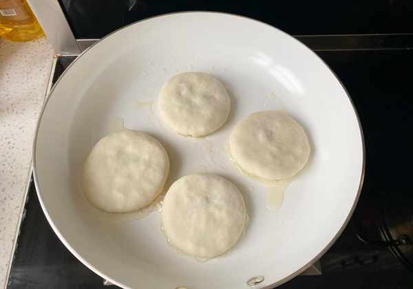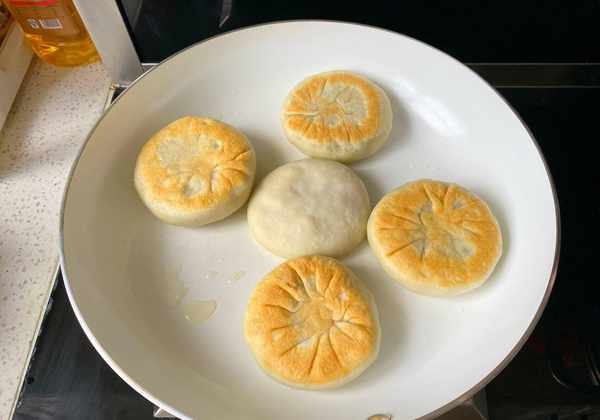 11、平底鍋小火燒熱,刷上一層植物油,然後放入餡餅,蓋上蓋子,小火加熱。
