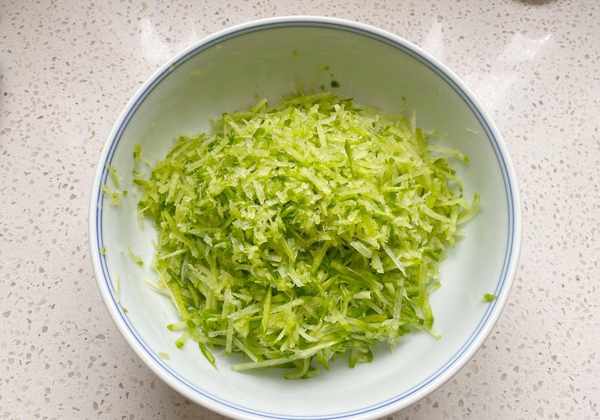3、揉面的時候,我們把青蘿卜清洗幹凈,用刨絲器刨成蘿卜絲。