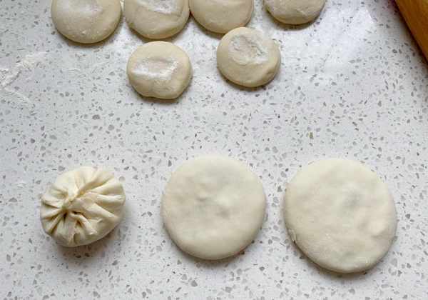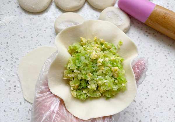 10、用包包子的方式把餡料包好,捏緊收口。用手掌輕輕按扁,成餡餅狀。