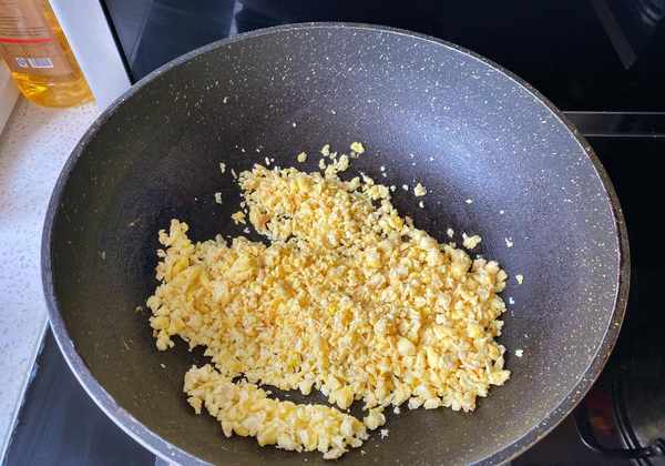 7、雞蛋打入碗裡,加入少許食鹽一起打散,炒鍋放入植物油,倒入雞蛋快速炒凝固結塊,用鏟子鏟碎,放涼。