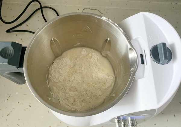 1、把面粉、熱水倒入廚師機杯裡,扣上蓋子,安裝於廚師機上。