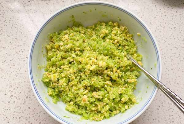 8、把蘿卜碎、雞蛋碎放入盆裡,加入五香粉、鹽、少許植物油一起拌勻,調成蘿卜雞蛋餡。