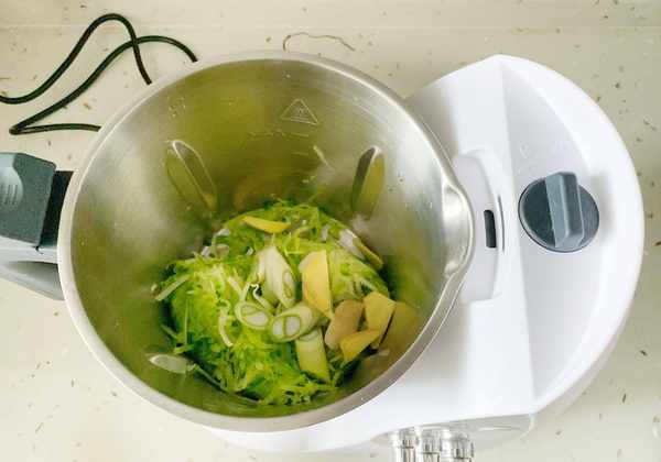 6、把焯水後的蘿卜絲,瀝幹水分,過冷水(可保持蘿卜的碧綠)沖洗一遍,捏幹水分,放入廚師機杯裡,蔥花、生薑一起放入,然後啟動廚師機快速料理功能,8秒打成蘿卜碎。