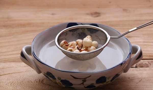 蓮子淘洗乾淨後,浸泡20分鐘,讓蓮子吸收一些水分,這樣更容易煮得軟糯。浸泡好的蓮子再用清水沖洗一下。