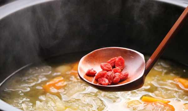 臨近收尾時,加入清洗乾淨的枸杞,馬上就可以關火了。枸杞不要長時間高溫加熱,以免破壞營養。
