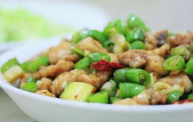 5、下入滑過油的雞丁及蠶豆、春筍丁、紅椒丁,加鹽3克、雞精3克、白糖2克調味,大火翻炒至斷生