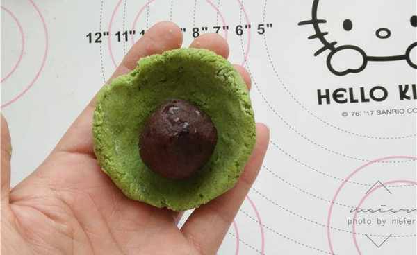 8、取一個小劑子用手壓扁,包入一顆豆沙餡或是其他喜歡的餡料,收緊收口。