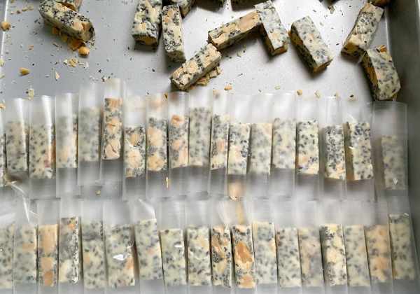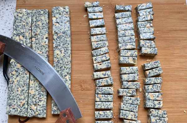 13、放至溫熱時取出,放在木板上,用刀切成塊狀。
