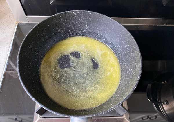5、把黃油放入不粘鍋裡,小火加熱,慢慢融化成時尚。