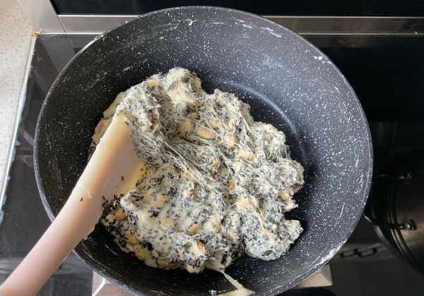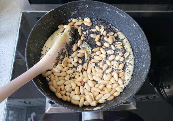 10、翻拌均勻的牛軋糖,花生黑芝麻和牛軋融在一起抱緊團,不粘鍋底,並且有長長的拉絲。