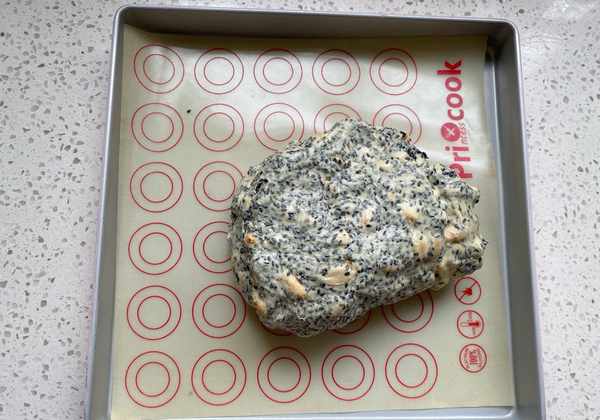 11、把牛軋糖倒入烤盤裡,戴上一次性手套,來回折疊3次揉勻。