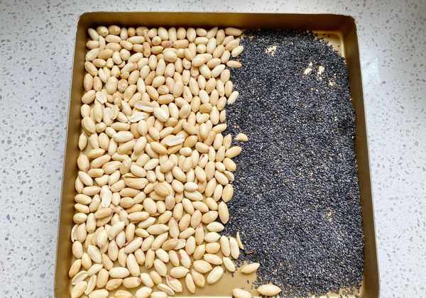4、把花生米和黑芝麻放入烤盤,入烤箱設置60度,溫熱狀態備用,花生米和黑芝麻溫熱,混合的時候方便融入。