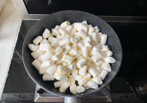 6、倒入棉花糖,用刮刀翻拌,使每個棉花糖上均勻沾滿黃油。