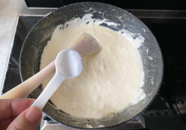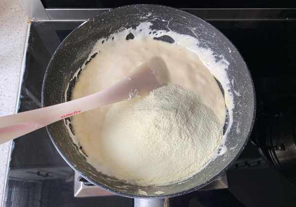 8、倒入奶粉,用刮刀翻拌,快速混合均勻,讓奶粉融化,燃氣關火。